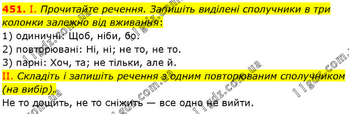І. Прочитайте речення. Запишіть виділені сполучники в три колонки залежно від вживання: 1) одиничні: Щоб, ніби, бо. 2) повторювані: Ні, ні; не то, не то. 3) парні: Хоч, та; не тільки, але й. II. Складіть і запишіть речення з одним повторюваним сполучником (на вибір). Не то дощить, не то сніжить — все одно не вийти.