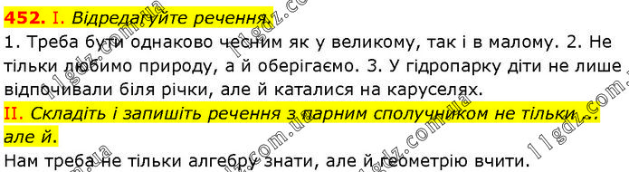 І. Відредагуйте речення. 1. Треба бути однаково чесним як у великому, так і в малому. 2. Не тільки любимо природу, а й оберігаємо. 3. У гідропарку діти не лише відпочивали біля річки, але й каталися на каруселях. II. Складіть і запишіть речення з парним сполучником не тільки ... але й. Нам треба не тільки алгебру знати, але й геометрію вчити.