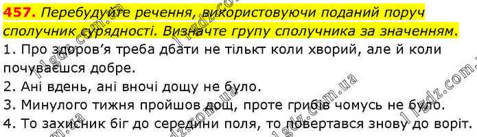 Перебудуйте речення, використовуючи поданий поруч сполучник сурядності. Визначте групу сполучника за значенням. 1. Про здоров’я треба дбати не тількт коли хворий, але й коли почуваєшся добре. 2. Ані вдень, ані вночі дощу не було. 3. Минулого тижня пройшов дощ, проте грибів чомусь не було. 4. То захисник біг до середини поля, то повертався знову до воріт.