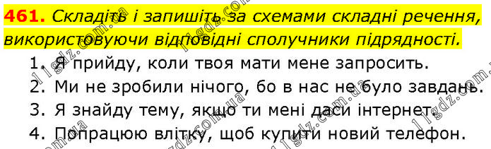 Складіть і запишіть за схемами складні речення, використовуючи відповідні сполучники підрядності. 1. Я прийду, коли твоя мати мене запросить. 2. Ми не зробили нічого, бо в нас не було завдань. 3. Я знайду тему, якщо ти мені даси інтернет. 4. Попрацюю влітку, щоб купити новий телефон.