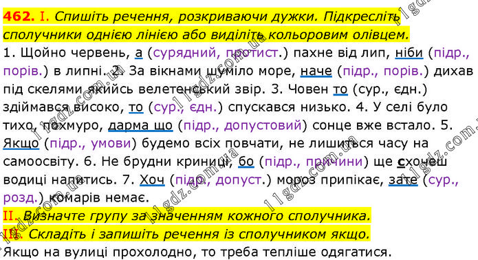 І. Спишіть речення, розкриваючи дужки. Підкресліть сполучники однією лінією або виділіть кольоровим олівцем. 1. Щойно червень, а (сурядний, протист.) пахне від лип, ніби (підр., порів.) в липні. 2. За вікнами шуміло море, наче (підр., порів.) дихав під скелями якийсь велетенський звір. 3. Човен то (сур., єдн.) здіймався високо, то (сур., єдн.) спускався низько. 4. У селі було тихо, похмуро, дарма що (підр., допустовий) сонце вже встало. 5. Якщо (підр., умови) будемо всіх повчати, не лишиться часу на самоосвіту. 6. Не брудни криниці, бо (підр., причини) ще схочеш водиці напитись. 7. Хоч (підр., допуст.) мороз припікає, зате (сур., розд.) комарів немає. II. Визначте групу за значенням кожного сполучника. III. Складіть і запишіть речення із сполучником якщо. Якщо на вулиці прохолодно, то треба тепліше одягатися.