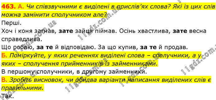 А. Чи співзвучними є виділені в прислів’ях слова? Які із цих слів можна замінити сполучником але? Перші. Хоч і коня загнав, зате зайця піймав. Осінь хвастлива, зате весна справедлива. Що роблю, за те й відповідаю. За що купив, за те й продав. Б. Поміркуйте, у яких реченнях виділені слова – сполучники, а у яких – сполучення прийменників із займенниками. В першому сполучники, в другому займенники. В. Зробіть висновок, чи обидва варіанти написання виділених слів є правильними. Так.