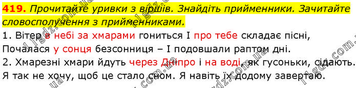 Прочитайте уривки з віршів. Знайдіть прийменники. Зачитайте словосполучення з прийменниками. 1. Вітер в небі за хмарами гониться І про тебе складає пісні, Почалася у сонця безсонниця – І подовшали раптом дні. 2. Хмарезні хмари йдуть через Дніпро і на воді, як гусоньки, сідають. Я так не хочу, щоб це стало сном. Я навіть їх додому завертаю.