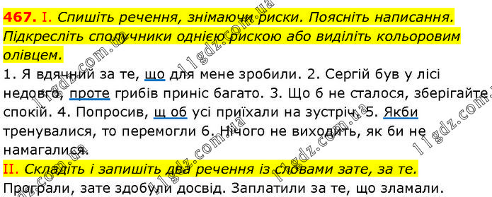І. Спишіть речення, знімаючи риски. Поясніть написання. Підкресліть сполучники однією рискою або виділіть кольоровим олівцем. 1. Я вдячний за те, що для мене зробили. 2. Сергій був у лісі недовго, проте грибів приніс багато. 3. Що б не сталося, зберігайте спокій. 4. Попросив, щ об усі приїхали на зустріч. 5. Якби тренувалися, то перемогли 6. Нічого не виходить, як би не намагалися. II. Складіть і запишіть два речення із словами зате, за те. Програли, зате здобули досвід. Заплатили за те, що зламали.