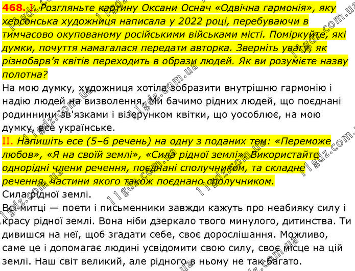 І. Розгляньте картину Оксани Оснач «Одвічна гармонія», яку херсонська художниця написала у 2022 році, перебуваючи в тимчасово окупованому російськими військами місті. Поміркуйте, які думки, почуття намагалася передати авторка. Зверніть увагу, як різнобарв’я квітів переходить в образи людей. Як ви розумієте назву полотна? На мою думку, художниця хотіла зобразити внутрішню гармонію і надію людей на визволення. Ми бачимо рідних людей, що поєднані родинними зв'язками і візерунком квітки, що уособлює, на мою думку, все українське. II. Напишіть есе (5–6 речень) на одну з поданих тем: «Переможе любов», «Я на своїй землі», «Сила рідної землі». Використайте однорідні члени речення, поєднані сполучником, та складне речення, частини якого також поєднано сполучником. Сила рідної землі. Всі митці — поети і письменники завжди кажуть про неабияку силу і красу рідної землі. Вона ніби дзеркало твого минулого, дитинства. Ти дивишся на неї, щоб згадати себе, своє дорослішання. Можливо, саме це і допомагає людині усвідомити свою силу, своє місце на цій землі. Наш світ великий, але рідного в ньому не так багато.