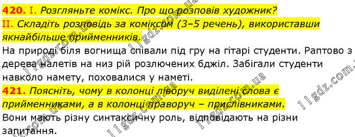 420. І. Розгляньте комікс. Про що розповів художник? II. Складіть розповідь за коміксом (3–5 речень), використавши якнайбільше прийменників. На природі біля вогнища співали під гру на гітарі студенти. Раптово з дерева налетів на низ рій розлючених бджіл. Забігали студенти навколо намету, поховалися у наметі. 421. Поясніть, чому в колонці ліворуч виділені слова є прийменниками, а в колонці праворуч – прислівниками. Вони мають різну синтаксичну роль, відповідають на різни запитання.