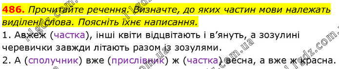 Прочитайте речення. Визначте, до яких частин мови належать виділені слова. Поясніть їхнє написання. 1. Авжеж (частка), інші квіти відцвітають і в’януть, а зозулині черевички завжди літають разом із зозулями. 2. А (сполучник) вже (прислівник) ж (частка) весна, а вже ж красна.