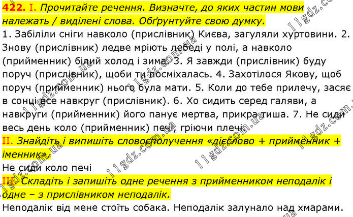 І. Прочитайте речення. Визначте, до яких частин мови належать / виділені слова. Обґрунтуйте свою думку. 1. Забіліли сніги навколо (прислівник) Києва, загуляли хуртовини. 2. Знову (прислівник) ледве мріють лебеді у полі, а навколо (прийменник) білий холод і зима. 3. Я завжди (прислівник) буду поруч (прислівник), щоби ти посміхалась. 4. Захотілося Якову, щоб поруч (прийменник) нього була мати. 5. Коли до тебе прилечу, засяє в сонці все навкруг (прислівник). 6. Хо сидить серед галяви, а навкруги (прийменник) його панує мертва, прикра тиша. 7. Не сиди весь день коло (прийменник) печі, гріючи плечі. II. Знайдіть і випишіть словосполучення «дієслово + прийменник + іменник». Не сиди коло печі. III. Складіть і запишіть одне речення з прийменником неподалік і одне – з прислівником неподалік. Неподалік від мене стоїть собака. Неподалік залунало над хмарами.
