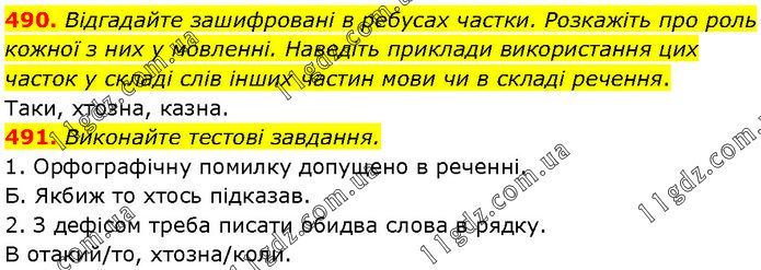 490. Відгадайте зашифровані в ребусах частки. Розкажіть про роль кожної з них у мовленні. Наведіть приклади використання цих часток у складі слів інших частин мови чи в складі речення. Таки, хтозна, казна. 491. Виконайте тестові завдання. 1. Орфографічну помилку допущено в реченні. Б. Якбиж то хтось підказав. 2. З дефісом треба писати обидва слова в рядку. В отакий/то, хтозна/коли.
