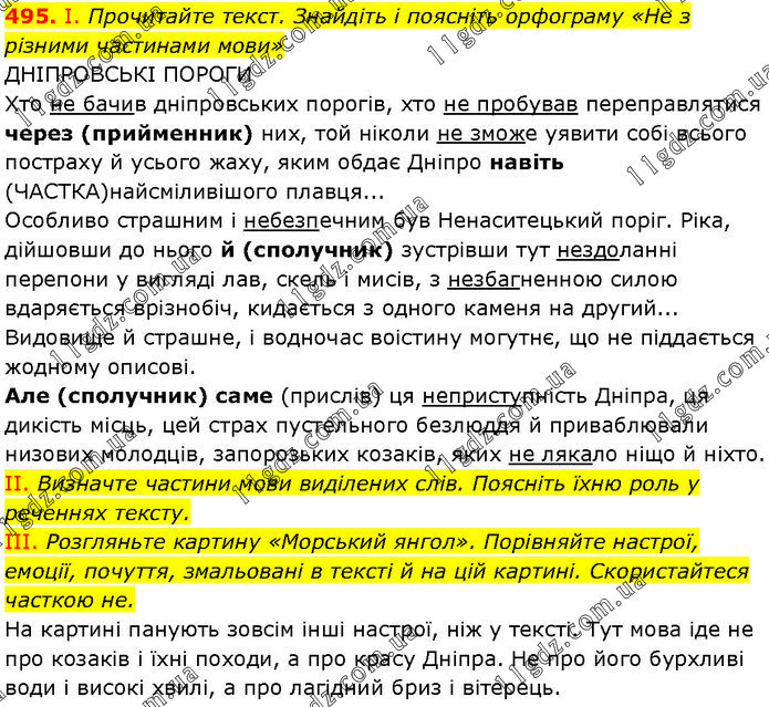 І. Прочитайте текст. Знайдіть і поясніть орфограму «Не з різними частинами мови» ДНІПРОВСЬКІ ПОРОГИ Хто не бачив дніпровських порогів, хто не пробував переправлятися через (прийменник) них, той ніколи не зможе уявити собі всього постраху й усього жаху, яким обдає Дніпро навіть (частка) найсміливішого плавця... Особливо страшним і небезпечним був Ненаситецький поріг. Ріка, дійшовши до нього й (сполучник) зустрівши тут нездоланні перепони у вигляді лав, скель і мисів, з незбагненною силою вдаряється врізнобіч, кидається з одного каменя на другий... Видовище й страшне, і водночас воістину могутнє, що не піддається жодному описові. Але (сполучник) саме (прислів.) ця неприступність Дніпра, ця дикість місць, цей страх пустельного безлюддя й приваблювали низових молодців, запорозьких козаків, яких не лякало ніщо й ніхто. II. Визначте частини мови виділених слів. Поясніть їхню роль у реченнях тексту. III. Розгляньте картину «Морський янгол». Порівняйте настрої, емоції, почуття, змальовані в тексті й на цій картині. Скористайтеся часткою не. На картині панують зовсім інші настрої, ніж у тексті. Тут мова іде не про козаків і їхні походи, а про красу Дніпра. Не про його бурхливі води і високі хвилі, а про лагідний бриз і вітерець.