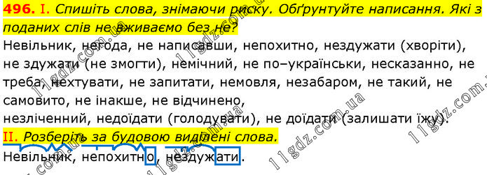 І. Спишіть слова, знімаючи риску. Обґрунтуйте написання. Які з поданих слів не вживаємо без не? Невільник, негода, не написавши, непохитно, нездужати (хворіти), не здужати (не змогти), немічний, не по–українськи, несказанно, не треба, нехтувати, не запитати, немовля, незабаром, не такий, не самовито, не інакше, не відчинено, незліченний, недоїдати (голодувати), не доїдати (залишати їжу). II. Розберіть за будовою виділені слова. Невільник, непохитно, нездужати.