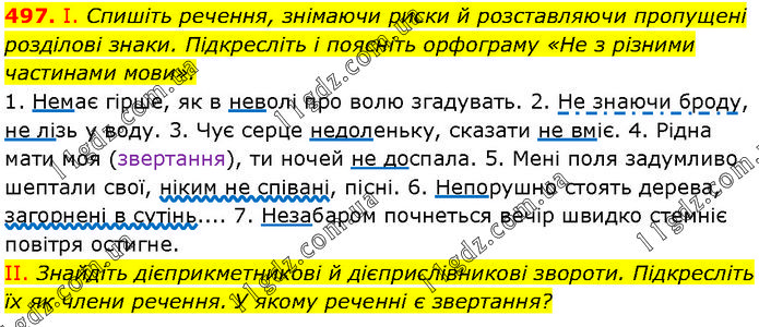 І. Спишіть речення, знімаючи риски й розставляючи пропущені розділові знаки. Підкресліть і поясніть орфограму «Не з різними частинами мови». 1. Немає гірше, як в неволі про волю згадувать. 2. Не знаючи броду, не лізь у воду. 3. Чує серце недоленьку, сказати не вміє. 4. Рідна мати моя (звертання), ти ночей не доспала. 5. Мені поля задумливо шептали свої, ніким не співані, пісні. 6. Непорушно стоять дерева, загорнені в сутінь.... 7. Незабаром почнеться вечір швидко стемніє повітря остигне. II. Знайдіть дієприкметникові й дієприслівникові звороти. Підкресліть їх як члени речення. У якому реченні є звертання?