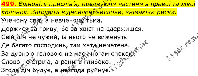 Відновіть прислів’я, поєднуючи частини з правої та лівої колонок. Запишіть відновлені вислови, знімаючи риски. Ученому світ, а невченому тьма. Держися за гриву, бо за хвіст не вдержишся. Свій дім не чужий, із нього не виженуть. Де багато господинь, там хата неметена. За дурною головою не має і ногам спокою. Слово не стріла, а ранить глибоко. Згода дім будує, а незгода руйнує.