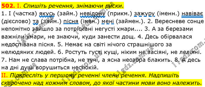 І. Спишіть речення, знімаючи риски. 1. І (частка) якусь (займ.) невідому (прикм.) зажуру (іменн.) навіває (дієслово) та (займ.) пісня (імен.) мені (займен.). 2. Вересневе сонце непомітно зайшло за потріскані негусті хмари.... 3. А за березами важніли хмари, не знаючи, куди занести дощ. 4. Десь обірвалася недоспівана пісня. 5. Немає на світі нічого страшнішого за нелюдяних людей. 6. Ростуть густі кущі, ніким не засіяні, не леліяні. 7. Нам не слава потрібна, не тучі, а ясна неозора блакить. 8. А десь на дні душі ворушиться неспокій. II. Підкресліть у першому реченні члени речення. Надпишіть скорочено над кожним словом, до якої частини мови воно належить.