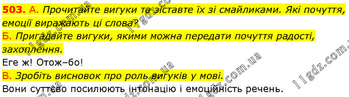А. Прочитайте вигуки та зіставте їх зі смайликами. Які почуття, емоції виражають ці слова? Б. Пригадайте вигуки, якими можна передати почуття радості, захоплення. Еге ж! Отож–бо! В. Зробіть висновок про роль вигуків у мові. Вони суттєво посилюють інтонацію і емоційність речень.