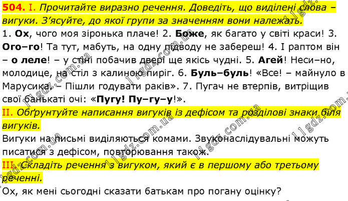 І. Прочитайте виразно речення. Доведіть, що виділені слова – вигуки. З’ясуйте, до якої групи за значенням вони належать. 1. Ох, чого моя зіронька плаче! 2. Боже, як багато у світі краси! 3. Ого–го! Та тут, мабуть, на одну підводу не забереш! 4. І раптом він – о леле! – у стіні побачив двері ще якісь чудні. 5. Агей! Неси–но, молодице, на стіл з калиною пиріг. 6. Буль–буль! «Все! – майнуло в Марусика. – Пішли годувати раків». 7. Пугач не втерпів, витріщив свої банькаті очі: «Пугу! Пу–гу–у!». II. Обґрунтуйте написання вигуків із дефісом та розділові знаки біля вигуків. Вигуки на письмі виділяються комами. Звуконаслідувальні можуть писатися з дефісом, повторювання також. III. Складіть речення з вигуком, який є в першому або третьому реченні. Ох, як мені сьогодні сказати батькам про погану оцінку?