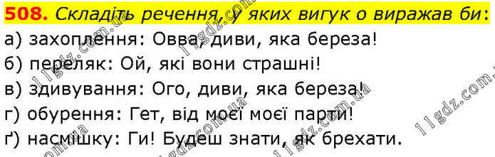 Складіть речення, у яких вигук о виражав би: а) захоплення: Овва, диви, яка береза! б) переляк: Ой, які вони страшні! в) здивування: Ого, диви, яка береза! г) обурення: Гет, від моєї моєї парти! ґ) насмішку: Ги! Будеш знати, як брехати.