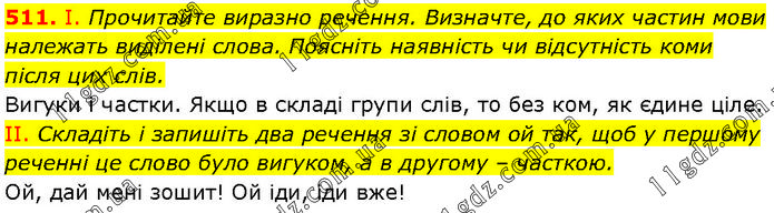 І. Прочитайте виразно речення. Визначте, до яких частин мови належать виділені слова. Поясніть наявність чи відсутність коми після цих слів. Вигуки і частки. Якщо в складі групи слів, то без ком, як єдине ціле. II. Складіть і запишіть два речення зі словом ой так, щоб у першому реченні це слово було вигуком, а в другому – часткою. Ой, дай мені зошит! Ой іди, іди вже!