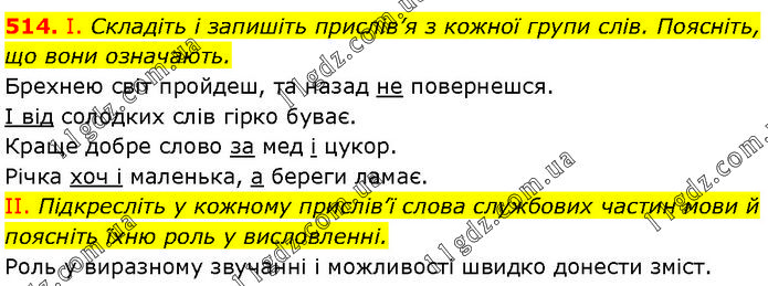 І. Складіть і запишіть прислів’я з кожної групи слів. Поясніть, що вони означають. Брехнею світ пройдеш, та назад не повернешся. І від солодких слів гірко буває. Краще добре слово за мед і цукор. Річка хоч і маленька, а береги ламає. II. Підкресліть у кожному прислів’ї слова службових частин мови й поясніть їхню роль у висловленні. Роль у виразному звучанні і можливості швидко донести зміст.