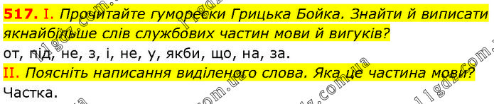 І. Прочитайте гуморески Грицька Бойка. Знайти й виписати якнайбільше слів службових частин мови й вигуків? от, під, не, з, і, не, у, якби, що, на, за. II. Поясніть написання виділеного слова. Яка це частина мови? Частка.
