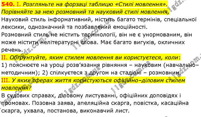 І. Розгляньте на форзаці таблицю «Стилі мовлення». Порівняйте за нею розмовний та науковий стилі мовлення. Науковий стиль інформативний, містить багато термінів, спеціальної лексики, однозначний та позбавлений емоційності. Розмовний стиль не містить термінології, він не є унормованим, він може містити нелітературні слова. Має багато вигуків, окличних речень. II. Обґрунтуйте, яким стилем мовлення ви користуєтеся, коли: 1) пояснюєте на уроці розв’язання рівняння – науковим (навчально–методичним); 2) спілкуєтеся з другом на стадіоні – розмовним. III. У яких сферах життя користуються офіційно–діловим стилем мовлення? В судових справах, діловому листуванні, офіційних доповідях і промовах. Позовна заява, апеляційна скарга, повістка, касаційна скарга, ухвала, постанова, виконавчий лист.