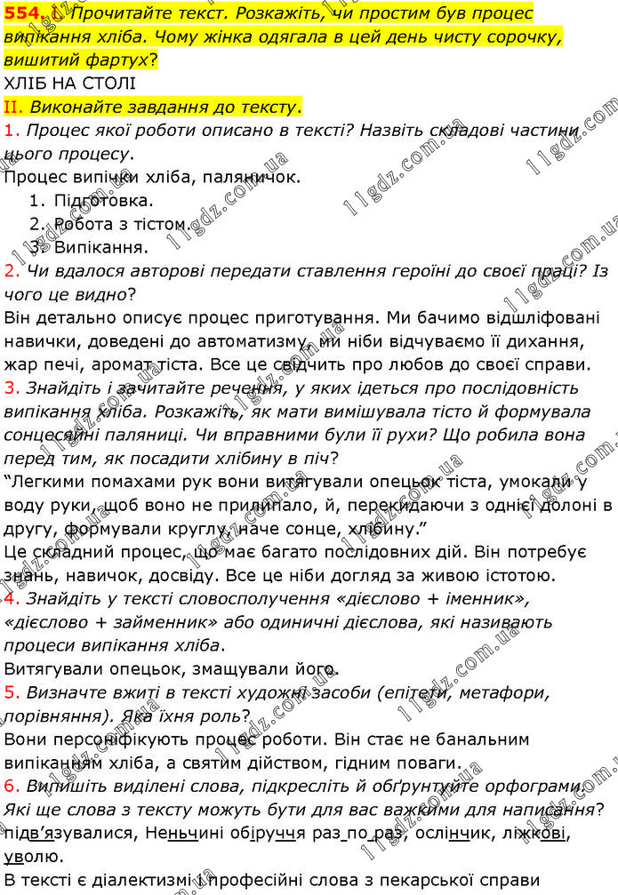 І. Прочитайте текст. Розкажіть, чи простим був процес випікання хліба. Чому жінка одягала в цей день чисту сорочку, вишитий фартух? ХЛІБ НА СТОЛІ II. Виконайте завдання до тексту. 1. Процес якої роботи описано в тексті? Назвіть складові частини цього процесу. Процес випічки хліба, паляничок. 1. Підготовка. 2. Робота з тістом. 3. Випікання. 2. Чи вдалося авторові передати ставлення героїні до своєї праці? Із чого це видно? Він детально описує процес приготування. Ми бачимо відшліфовані навички, доведені до автоматизму, ми ніби відчуваємо її дихання, жар печі, аромат тіста. Все це свідчить про любов до своєї справи. 3. Знайдіть і зачитайте речення, у яких ідеться про послідовність випікання хліба. Розкажіть, як мати вимішувала тісто й формувала сонцесяйні паляниці. Чи вправними були її рухи? Що робила вона перед тим, як посадити хлібину в піч? “Легкими помахами рук вони витягували опецьок тіста, умокали у воду руки, щоб воно не прилипало, й, перекидаючи з однієї долоні в другу, формували круглу, наче сонце, хлібину.” Це складний процес, що має багато послідовних дій. Він потребує знань, навичок, досвіду. Все це ніби догляд за живою істотою. 4. Знайдіть у тексті словосполучення «дієслово + іменник», «дієслово + займенник» або одиничні дієслова, які називають процеси випікання хліба. Витягували опецьок, змащували його. 5. Визначте вжиті в тексті художні засоби (епітети, метафори, порівняння). Яка їхня роль? Вони персоніфікують процес роботи. Він стає не банальним випіканням хліба, а святим дійством, гідним поваги. 6. Випишіть виділені слова, підкресліть й обґрунтуйте орфограми. Які ще слова з тексту можуть бути для вас важкими для написання? підв’язувалися, Неньчині обіруччя раз по раз, ослінчик, ліжкові, уволю. В тексті є діалектизмі і професійні слова з пекарської справи