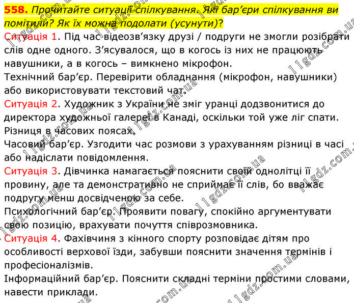 Прочитайте ситуації спілкування. Які бар’єри спілкування ви помітили? Як їх можна подолати (усунути)? Ситуація 1. Під час відеозв’язку друзі / подруги не змогли розібрати слів одне одного. З’ясувалося, що в когось із них не працюють навушники, а в когось – вимкнено мікрофон. Технічний бар’єр. Перевірити обладнання (мікрофон, навушники) або використовувати текстовий чат. Ситуація 2. Художник з України не зміг уранці додзвонитися до директора художньої галереї в Канаді, оскільки той уже ліг спати. Різниця в часових поясах. Часовий бар’єр. Узгодити час розмови з урахуванням різниці в часі або надіслати повідомлення. Ситуація 3. Дівчинка намагається пояснити своїй однолітці її провину, але та демонстративно не сприймає її слів, бо вважає подругу менш досвідченою за себе. Психологічний бар’єр. Проявити повагу, спокійно аргументувати свою позицію, врахувати почуття співрозмовника. Ситуація 4. Фахівчиня з кінного спорту розповідає дітям про особливості верхової їзди, забувши пояснити значення термінів і професіоналізмів. Інформаційний бар’єр. Пояснити складні терміни простими словами, навести приклади.
