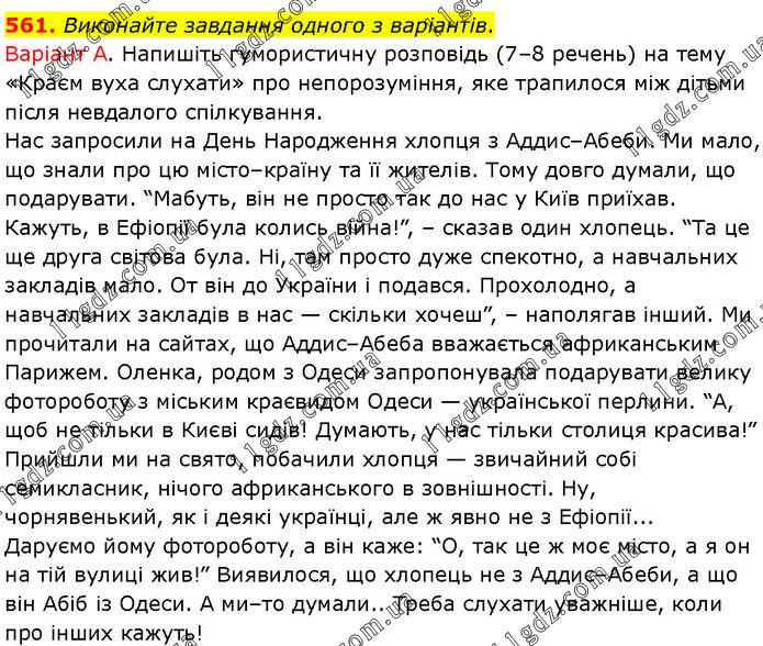 Виконайте завдання одного з варіантів. Варіант А. Напишіть гумористичну розповідь (7–8 речень) на тему «Краєм вуха слухати» про непорозуміння, яке трапилося між дітьми після невдалого спілкування. Нас запросили на День Народження хлопця з Аддис–Абеби. Ми мало, що знали про цю місто–країну та її жителів. Тому довго думали, що подарувати. “Мабуть, він не просто так до нас у Київ приїхав. Кажуть, в Ефіопії була колись війна!”, – сказав один хлопець. “Та це ще друга світова була. Ні, там просто дуже спекотно, а навчальних закладів мало. От він до України і подався. Прохолодно, а навчальних закладів в нас — скільки хочеш”, – наполягав інший. Ми прочитали на сайтах, що Аддис–Абеба вважається африканським Парижем. Оленка, родом з Одеси запропонувала подарувати велику фотороботу з міським краєвидом Одеси — української перлини. “А, щоб не тільки в Києві сидів! Думають, у нас тільки столиця красива!” Прийшли ми на свято, побачили хлопця — звичайний собі семикласник, нічого африканського в зовнішності. Ну, чорнявенький, як і деякі українці, але ж явно не з Ефіопії... Даруємо йому фотороботу, а він каже: “О, так це ж моє місто, а я он на тій вулиці жив!” Виявилося, що хлопець не з Аддис–Абеби, а що він Абіб із Одеси. А ми–то думали.. Треба слухати уважніше, коли про інших кажуть!