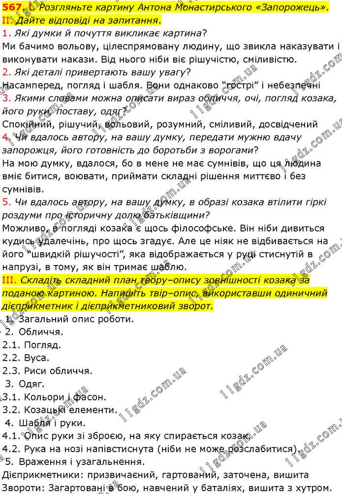 І. Розгляньте картину Антона Монастирського «Запорожець». II. Дайте відповіді на запитання. 1. Які думки й почуття викликає картина? Ми бачимо вольову, цілеспрямовану людину, що звикла наказувати і виконувати накази. Від нього ніби віє рішучістю, сміливістю. 2. Які деталі привертають вашу увагу? Насамперед, погляд і шабля. Вони однаково “гострі” і небезпечні 3. Якими словами можна описати вираз обличчя, очі, погляд козака, його руки, поставу, одяг? Спокійний, рішучий, вольовий, розумний, сміливий, досвідчений 4. Чи вдалось автору, на вашу думку, передати мужню вдачу запорожця, його готовність до боротьби з ворогами? На мою думку, вдалося, бо в мене не має сумнівів, що ця людина вміє битися, воювати, приймати складні рішення миттєво і без сумнівів. 5. Чи вдалось автору, на вашу думку, в образі козака втілити гіркі роздуми про історичну долю батьківщини? Можливо, в погляді козака є щось філософське. Він ніби дивиться кудись удалечінь, про щось згадує. Але це ніяк не відбивається на його “швидкій рішучості”, яка відображається у руці стиснутій в напрузі, в тому, як він тримає шаблю. III. Складіть складний план твору–опису зовнішності козака за поданою картиною. Напишіть твір–опис, використавши одиничний дієприкметник і дієприкметниковий зворот. 1. Загальний опис роботи. 2. Обличчя. 2.1. Погляд. 2.2. Вуса. 2.3. Риси обличчя. 3. Одяг. 3.1. Кольори і фасон. 3.2. Козацькі елементи. 4. Шабля і руки. 4.1. Опис руки зі зброєю, на яку спирається козак. 4.2. Рука на нозі напівстиснута (ніби не може розслабитися). 5. Враження і узагальнення. Дієприкметники: призвичаєний, гартований, заточена, вишита Звороти: Загартовані в бою, навчений у баталіях, вишита з хутром.