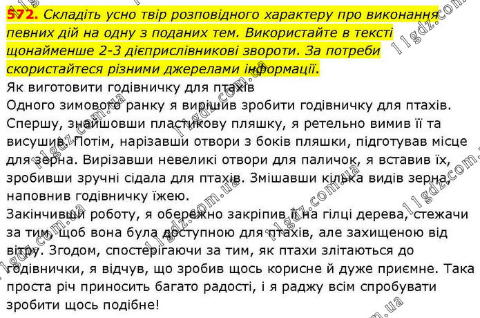 Складіть усно твір розповідного характеру про виконання певних дій на одну з поданих тем. Використайте в тексті щонайменше 2-3 дієприслівникові звороти. За потреби скористайтеся різними джерелами інформації. Як виготовити годівничку для птахів Одного зимового ранку я вирішив зробити годівничку для птахів. Спершу, знайшовши пластикову пляшку, я ретельно вимив її та висушив. Потім, нарізавши отвори з боків пляшки, підготував місце для зерна. Вирізавши невеликі отвори для паличок, я вставив їх, зробивши зручні сідала для птахів. Змішавши кілька видів зерна, наповнив годівничку їжею. Закінчивши роботу, я обережно закріпив її на гілці дерева, стежачи за тим, щоб вона була доступною для птахів, але захищеною від вітру. Згодом, спостерігаючи за тим, як птахи злітаються до годівнички, я відчув, що зробив щось корисне й дуже приємне. Така проста річ приносить багато радості, і я раджу всім спробувати зробити щось подібне!