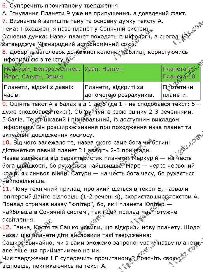 6. Суперечить прочитаному твердження А. Існування Планети 9 уже не припущення, а доведений факт. 7. Визначте й запишіть тему та основну думку тексту А. Тема: Походження назв планет у Сонячній системі. Основна думка: Назви планет походять із міфології, а сьогодні їх затверджує Міжнародний астрономічний союз. 8. Доберіть заголовок до кожної колонки таблиці, користуючись інформацією з тексту А. Меркурій, Венера, Юпітер, Марс, Сатурн, Земля Уран, Нептун Планета 9, Планета 10 Планети, відомі з давніх часів. Планети, відкриті за допомогою розрахунків. Гіпотетичні планети. 9. Оцініть текст А в балах від 1 до 5 (де 1 - не сподобався текст; 5 - дуже сподобався текст). Обґрунтуйте свою оцінку 2-3 реченнями. 5 балів. Текст цікавий і пізнавальний, із доступним викладом інформації. Він розширює знання про походження назв планет та актуальні дослідження космосу. 10. Від чого залежало те, назва якого саме бога чи богині дістанеться певній планеті? Наведіть 2-3 приклади. Назва залежала від характеристик планети: Меркурій — на честь бога швидкості, бо рухається найшвидше. Марс — через червоний колір, як символ війни. Сатурн — на честь бога часу, бо рухається найповільніше. 11. Чому технічний прилад, про який ідеться в тексті Б, назвали юпітером? Дайте відповідь (1-2 речення), скориставшись текстом А. Прилад отримав назву "юпітер", бо, як і планета Юпітер — найбільша в Сонячній системі, так і цей прилад має потужне освітлення. 12. Ганна, Костя та Сашко уявили, що відкрили нову планету. Щодо назви цієї планети діти висловили такі твердження: Сашко: Звичайно, ми з вами зможемо запропонувати назву планети, але рішення прийматимемо не ми. Чиє твердження НЕ суперечить прочитаному? Поясніть свою відповідь, покликаючись на текст А.