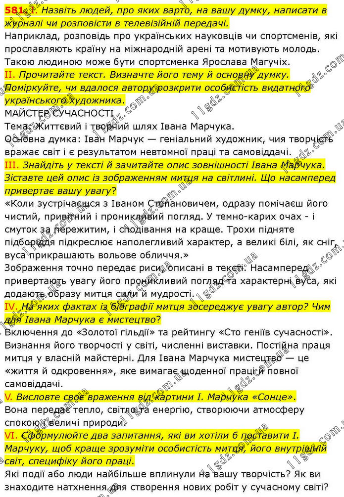 І. Назвіть людей, про яких варто, на вашу думку, написати в журналі чи розповісти в телевізійній передачі. Наприклад, розповідь про українських науковців чи спортсменів, які прославляють країну на міжнародній арені та мотивують молодь. Такою людиною може бути спортсменка Ярослава Магучіх. ІІ. Прочитайте текст. Визначте його тему й основну думку. Поміркуйте, чи вдалося автору розкрити особистість видатного українського художника. МАЙСТЕР СУЧАСНОСТІ Тема: Життєвий і творчий шлях Івана Марчука. Основна думка: Іван Марчук — геніальний художник, чия творчість вражає світ і є результатом невтомної праці та самовіддачі. ІІІ. Знайдіть у тексті й зачитайте опис зовнішності Івана Марчука. Зіставте цей опис із зображенням митця на світлині. Що насамперед привертає вашу увагу? «Коли зустрічаєшся з Іваном Степановичем, одразу помічаєш його чистий, привітний і проникливий погляд. У темно-карих очах - і смуток за пережитим, і сподівання на краще. Трохи підняте підборіддя підкреслює наполегливий характер, а великі білі, як сніг, вуса прикрашають вольове обличчя.» Зображення точно передає риси, описані в тексті. Насамперед привертають увагу його проникливий погляд та характерні вуса, які додають образу митця сили й мудрості. IV. На яких фактах із біографії митця зосереджує увагу автор? Чим для Івана Марчука є мистецтво? Включення до «Золотої гільдії» та рейтингу «Сто геніїв сучасності». Визнання його творчості у світі, численні виставки. Постійна праця митця у власній майстерні. Для Івана Марчука мистецтво — це «життя й одкровення», яке вимагає щоденної праці й повної самовіддачі. V. Висловте своє враження від картини І. Марчука «Сонце». Вона передає тепло, світло та енергію, створюючи атмосферу спокою і величі природи. VI. Сформулюйте два запитання, які ви хотіли б поставити І. Марчуку, щоб краще зрозуміти особистість митця, його внутрішній світ, специфіку його праці. Які події або люди найбільше вплинули на вашу творчість? Як ви знаходите натхнення для створення нових робіт у сучасному світі?