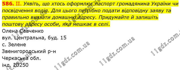 ІІ. Уявіть, що хтось оформлює паспорт громадянина України чи посвідчення водія. Для цього потрібно подати відповідну заяву та правильно вказати домашню адресу. Придумайте й запишіть поштову адресу особи, яка мешкає в селі. Олена Савченко вул. Центральна, буд. 15 с. Зелене Звенигородський р-н Черкаська обл. інд. 20250