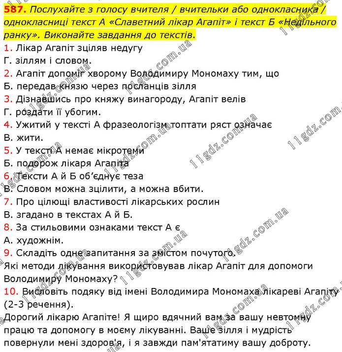 Послухайте з голосу вчителя / вчительки або однокласника / однокласниці текст А «Славетний лікар Агапіт» і текст Б «Недільного ранку». Виконайте завдання до текстів. 1. Лікар Агапіт зціляв недугу Г. зіллям і словом. 2. Агапіт допоміг хворому Володимиру Мономаху тим, що Б. передав князю через посланців зілля 3. Дізнавшись про княжу винагороду, Агапіт велів Г. роздати її убогим. 4. Ужитий у тексті А фразеологізм топтати ряст означає В. жити. 5. У тексті А немає мікротеми Б. подорож лікаря Агапіта 6. Тексти А й Б об’єднує теза В. Словом можна зцілити, а можна вбити. 7. Про цілющі властивості лікарських рослин В. згадано в текстах А й Б. 8. За стильовими ознаками текст А є А. художнім. 9. Складіть одне запитання за змістом почутого. Які методи лікування використовував лікар Агапіт для допомоги Володимиру Мономаху? 10. Висловіть подяку від імені Володимира Мономаха лікареві Агапіту (2-3 речення). Дорогий лікарю Агапіте! Я щиро вдячний вам за вашу невтомну працю та допомогу в моєму лікуванні. Ваше зілля і мудрість повернули мені здоров'я, і я завжди пам'ятатиму вашу доброту.