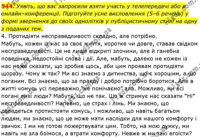 Уявіть, що вас запросили взяти участь у телепередачі або в онлайн–конференції. Підготуйте усне висловлення (5–6 речень) у формі звернення до своїх однолітків у публіцистичному стилі на одну з поданих тем. 4. Протидіяти несправедливості складно, але потрібно. Мабуть, кожен із нас за своє життя, коротке чи довге, ставав свідком несправедливості. Це не лише відкриті злочини, але й ганебна поведінка, недостойні слова і дії. Але, мабуть, далеко не кожен із нас може сказати, що зробив щось, аби цим проявам протидіяти щоразу. Чому ж так? Ми всі знаємо з дитинства, що є хорошим, а що поганим. Всі знаємо, що за правду і добро потрібно боротися. Але в житті чомусь усі переважно “не помічаємо” зла. Можливо, ми всі погані лихі люди? Мабуть, що не так. Що ж стримує нас сказати “Ні” несправедливості? Напевно, це страх і лінь. Ми знаємо, що доведеться протистояти комусь, і можливо, що навіть багатьом людям, ми знаємо, що це може мати наслідки для нашого комфорту і звичок. І ми не готові пожертвувати цим. Тобто, на мою думку, ми навіть не зла боїмося, а втрати комфорту. Невже ж ми такі егоїсти?