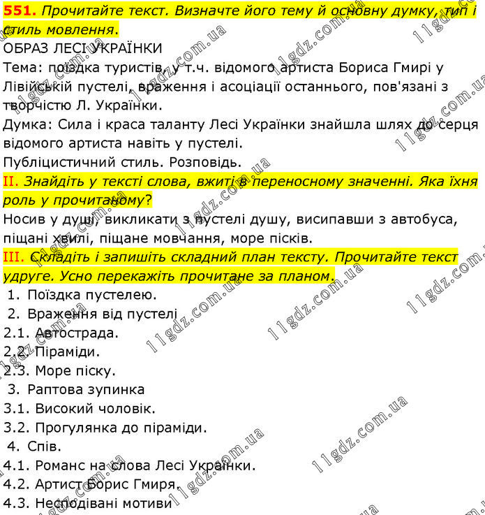 Прочитайте текст. Визначте його тему й основну думку, тип і стиль мовлення. ОБРАЗ ЛЕСІ УКРАЇНКИ Тема: поїздка туристів, у т.ч. відомого артиста Бориса Гмирі у Лівійській пустелі, враження і асоціації останнього, пов'язані з творчістю Л. Українки. Думка: Сила і краса таланту Лесі Українки знайшла шлях до серця відомого артиста навіть у пустелі. Публіцистичний стиль. Розповідь. II. Знайдіть у тексті слова, вжиті в переносному значенні. Яка їхня роль у прочитаному? Носив у душі, викликати з пустелі душу, висипавши з автобуса, піщані хвилі, піщане мовчання, море пісків. ІІІ. Складіть і запишіть складний план тексту. Прочитайте текст удруге. Усно перекажіть прочитане за планом. 1. Поїздка пустелею. 2. Враження від пустелі 2.1. Автострада. 2.2. Піраміди. 2.3. Море піску. 3. Раптова зупинка 3.1. Високий чоловік. 3.2. Прогулянка до піраміди. 4. Спів. 4.1. Романс на слова Лесі Українки. 4.2. Артист Борис Гмиря. 4.3. Несподівані мотиви