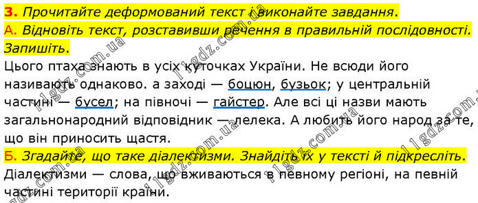 Прочитайте деформований текст і виконайте завдання. А. Відновіть текст, розставивши речення в правильній послідовності. Запишіть. Цього птаха знають в усіх куточках України. Не всюди його називають однаково. а заході — боцюн, бузьок; у центральній частині — бусел; на півночі — гайстер. Але всі ці назви мають загальнонародний відповідник — лелека. А любить його народ за те, що він приносить щастя. Б. Згадайте, що таке діалектизми. Знайдіть їх у тексті й підкресліть. Діалектизми — слова, що вживаються в певному регіоні, на певній частині території країни.