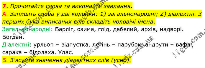 Прочитайте слова та виконайте завдання. А. Запишіть слова у дві колонки: 1) загальнонародні; 2) діалектні. 3 перших букв виписаних слів складіть чоловічі імена. Загальнонародні: Барліг, озима, глід, дебелий, архів, надворі. Богдан. Діалектні: урльоп – відпустка, легінь – парубок, андрути – вафлі, сарака – бідолаха. Улас. Б. З’ясуйте значення діалектних слів (усно).