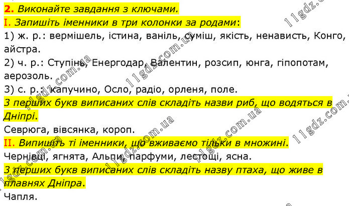 Виконайте завдання з ключами. I. Запишіть іменники в три колонки за родами: 1) ж. р.: вермішель, істина, ваніль, суміш, якість, ненависть, Конго, айстра. 2) ч. р.: Ступінь, Енергодар, Валентин, розсип, юнга, гіпопотам, аерозоль. 3) с. р.: капучино, Осло, радіо, орленя, поле. 3 перших букв виписаних слів складіть назви риб, що водяться в Дніпрі. Севрюга, вівсянка, короп. II. Випишіть ті іменники, що вживаємо тільки в множині. Чернівці, ягнята, Альпи, парфуми, лестощі, ясна. 3 перших букв виписаних слів складіть назву птаха, що живе в плавнях Дніпра. Чапля.