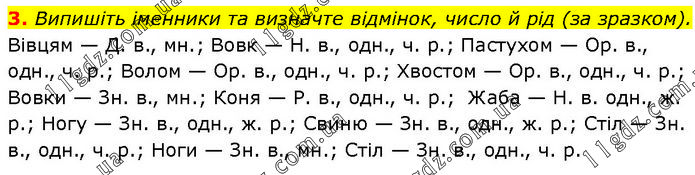 Випишіть іменники та визначте відмінок, число й рід (за зразком). Вівцям — Д. в., мн.; Вовк — Н. в., одн., ч. р.; Пастухом — Ор. в., одн., ч. р.; Волом — Ор. в., одн., ч. р.; Хвостом — Ор. в., одн., ч. р.; Вовки — Зн. в., мн.; Коня — Р. в., одн., ч. р.; Жаба — Н. в. одн., ж. р.; Ногу — Зн. в., одн., ж. р.; Свиню — Зн. в., одн., ж. р.; Стіл — Зн. в., одн., ч. р.; Ноги — Зн. в., мн.; Стіл — Зн. в., одн., ч. р.