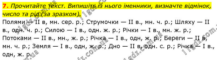 Прочитайте текст. Випишіть із нього іменники, визначте відмінок, число та рід (за зразком). Полями — ІІ в, мн. сер. р.; Струмочки — ІІ в., мн. ч. р.; Шляху — ІІ в., одн. ч. р.; Силою — І в., одн. ж. р.; Річки — І в., мн. ж. р.; Потоками — ІІ в., мн., ж. р.; Річка — І в., одн, ж. р.; Береги — ІІ в, мн. ч. р.; Земля — І в., одн, ж. р.; Дно — ІІ в, одн. с. р.; Річка — І в., одн, ж. р.