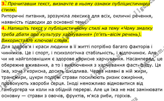 3. Прочитавши текст, визначте в ньому ознаки публіцистичного стилю. Риторичні питання, зрозуміла лексика для всіх, окличні речення, наявність підводки до основної теми. 4. Напишіть текст у публіцистичному стилі на тему «Чому змалку треба дбати про культуру харчування» (п’ять–вісім речень). Використайте ключові слова. Для здоров'я і краси людини в її житті потрібно багато факторів і чинників. Це і спорт, і психологічна стабільність, і відпочинок. Але чи не найголовнішим є здорове корисне харчування. Насамперед, це обережне вживання, а то і виключення з харчування фаст–фуду. Ця їжа, хоча і корисна, досить шкідлива. Через наявні в ній жири, трансжири, цукри подібні страви посилюють ризик ожиріння, провокують хвороби серця. Іноді неможливо відмовитися від гамбургера чи коли на обідній перерві. Але ця їжа не має замінювати основну — страви з овочів, фруктів, м'яса риби, горіхів.