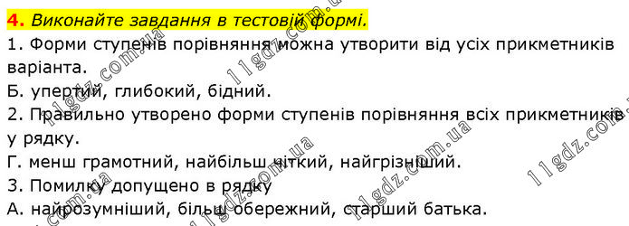 Виконайте завдання в тестовій формі. 1. Форми ступенів порівняння можна утворити від усіх прикметників варіанта. Б. упертий, глибокий, бідний. 2. Правильно утворено форми ступенів порівняння всіх прикметників у рядку. Г. менш грамотний, найбільш чіткий, найгрізніший. 3. Помилку допущено в рядку А. найрозумніший, більш обережний, старший батька.