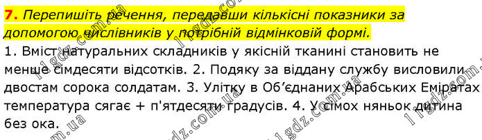 Перепишіть речення, передавши кількісні показники за допомогою числівників у потрібній відмінковій формі. 1. Вміст натуральних складників у якісній тканині становить не менше сімдесяти відсотків. 2. Подяку за віддану службу висловили двостам сорока солдатам. 3. Улітку в Об’єднаних Арабських Еміратах температура сягає + п'ятдесяти градусів. 4. У сімох няньок дитина без ока.
