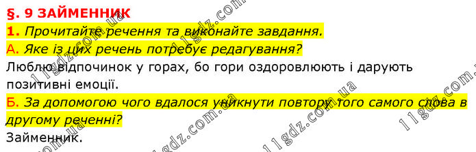 §. 9 ЗАЙМЕННИК 1. Прочитайте речення та виконайте завдання. А. Яке із цих речень потребує редагування? Люблю відпочинок у горах, бо гори оздоровлюють і дарують позитивні емоції. Б. За допомогою чого вдалося уникнути повтору того самого слова в другому реченні? Займенник.