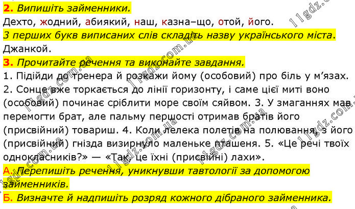 2. Випишіть займенники. Дехто, жодний, абиякий, наш, казна–що, отой, його. 3 перших букв виписаних слів складіть назву українського міста. Джанкой. 3. Прочитайте речення та виконайте завдання. 1. Підійди до тренера й розкажи йому (особовий) про біль у м’язах. 2. Сонце вже торкається до лінії горизонту, і саме цієї миті воно (особовий) починає сріблити море своїм сяйвом. 3. У змаганнях мав перемогти брат, але пальму першості отримав братів його (присвійний) товариш. 4. Коли лелека полетів на полювання, з його (присвійний) гнізда визирнуло маленьке пташеня. 5. «Це речі твоїх однокласників?» — «Так, це їхні (присвійні) лахи». А. Перепишіть речення, уникнувши тавтології за допомогою займенників. Б. Визначте й надпишіть розряд кожного дібраного займенника.