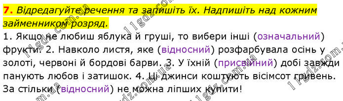 Відредагуйте речення та запишіть їх. Надпишіть над кожним займенником розряд. 1. Якщо не любиш яблука й груші, то вибери інші (означальний) фрукти. 2. Навколо листя, яке (відносний) розфарбувала осінь у золоті, червоні й бордові барви. 3. У їхній (присвійний) добі завжди панують любов і затишок. 4. Ці джинси коштують вісімсот гривень. За стільки (відносний) не можна ліпших купити!