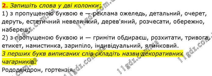 Запишіть слова у дві колонки: 1) з пропущеною буквою е — реклама ожеледь, детальний, очерет, деруть, естетичний невеличкий, дерев'яний, розчесати, обережно, набереш; 2) з пропущеною буквою и — гриміти обдираєш, розхитати, тривога, етикет, намистинка, зарипіло, індивідуальний, ялинковий. 3 перших букв виписаних слів складіть назви декоративних чагарників. Рододендрон, гортензія.
