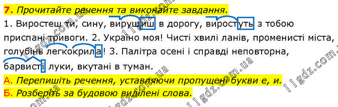 Прочитайте речення та виконайте завдання. 1. Виростеш ти, сину, вирушиш в дорогу, виростуть з тобою приспані тривоги. 2. Україно моя! Чисті хвилі ланів, променисті міста, голубінь легкокрила! 3. Палітра осені і справді неповторна, барвисті луки, вкутані в туман. А. Перепишіть речення, уставляючи пропущені букви е, и. Б. Розберіть за будовою виділені слова.
