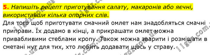 Напишіть рецепт приготування салату, макаронів або яєчні, використавши кілька опорних слів. Для того щоб приготувати смачний омлет нам знадобляться смачні приправи. Їх додамо в кінці, а прикрашати омлет можна привабливими стеблами кропу. Також можна зварити і розмішати в сметані нут для тих, хто любить додавати щось у страву.